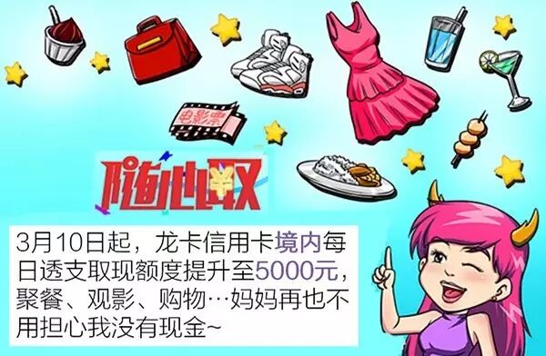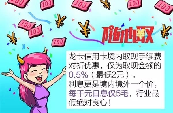 每次取现都要受制于2000元的限额?换张卡,不方便找朋友借,伤感情这样的日子结束啦!☟龙卡信用卡境内每卡每日透支取现限额提升至5000元啦!业内首批提额 Money随取随用~