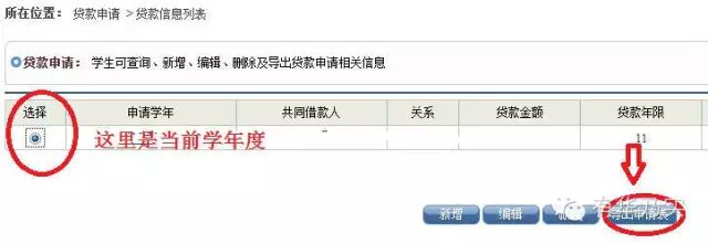第十七步,点击“返回”按钮后,单击“申请学年”前面的小圆圈,然后点击“导出申请表”。看到提示点“打开”,即可打开申请表,将《国家开发银行股份有限公司生源地信用助学贷款申请表》打印一份。