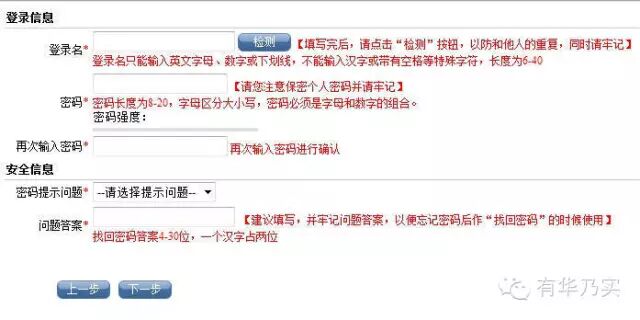 第八步,将如上图所示信息全部填写确认无误后点击“下一步”。在打开的如下图所示的页面中设置相关信息,并记录下来,以后办理相关手续时会用到。