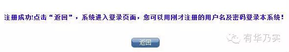 第十步,确认如上图所示部分正确无误后点击“提交”按钮。看到如下图所示提示注册成功的页面,点击“返回”。