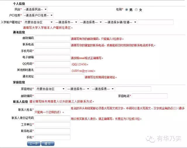 第九步,填写好如上图所示内容并确认无误后,记录下来,点下一步。在打开的页面认真填写每一项内容,不要留空。所有信息必须、完整、准确、有效,不得出错,否则会耽误你的办理时间或谢绝办理。【入学前户籍地址中,省、市、县、乡(镇)、村(社区)应直接点击下三角形符号选择,最后还应详细填写几组几社和门牌号;通讯地址的格式为:XX省XX市XX县XX乡(镇)XX村(社区、街道)XX社XX门牌号,家庭住址中的省、市、县、乡(镇)、村(社区)也是直接点击下三角形符号选择,同样应填写XX社和门牌号。所有地址信息必须详细、准确,确保能够有效联系!】如下图所示: