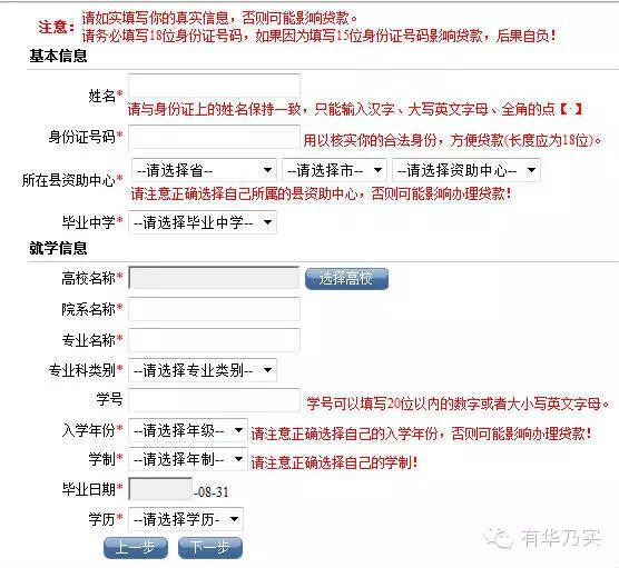 第七步,请认真如实按红字要求填写如下图所示的所有内容,该页信息将直接提交开发银行数据库。(所在资助中心直接点击下▲符号选择,毕业中学也是直接点击下三角形符号选择,如果没有,则直接输入)