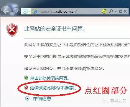 第三步,提示“此网站的安全证书有问题”时,点击“继续浏览此网站(不推荐)”,如下图红圈圈住部分。