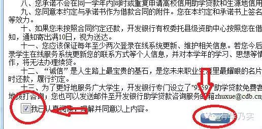 第十二步,如果弹出《国家开发银行生源地信用助学贷款约定与承诺书》请在“我已认真阅读,理解并同意以上内容”前打对勾(点击一次即可),具体示例如下图红圈圈住部分。然后点击“同意”按钮。如果无此弹窗可忽略此步。