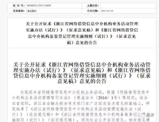 2017年12月18日,浙江省金融办发布关于公开征求《浙江省网络借贷信息中介机构业务活动管理实施办法(试行)》(征求意见稿)和《浙江省网络借贷信息中介机构备案登记管理实施细则(试行)》(征求意见稿)意见的公告。