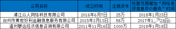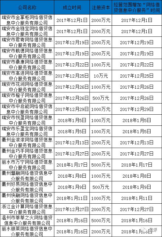 其中,20家公司名称中含“网络借贷信息中介”,注册时间集中在2017年12月到2018年1月间,注册地主要是温州瑞安、衢州和丽水。另外还有3家公司在2017年12月到2018年1月间经营范围新增“网络借贷信息中介服务”。