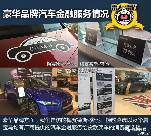 这里值得一提的是,捷豹路虎和梅赛德斯-奔驰的金融方案也十分有吸引力,店内的金融政策已经按车型的不同将月供甚至日供费用标列出来。例如奔驰C级,在贷款购车模式下首付只有6.2万元,月付为758元。需要说明的是,梅赛德斯-奔驰的金融政策是在分期期限内将贷款利息还清,到期后需要将购买车型的尾款付清,这种方式对于短期内有资金压力的消费者十分受用。