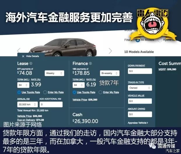 在贷款年限方面,国内普遍的免息年限是三年。就雷哥知道的,蔚来刚刚上市的ES8在分期贷的年限方面较长,最长还款期限是5年。但是在加拿大,贷款购车的期限最长可以选择7年。实际上,在国外的营销模式现在普遍流行的还有一种体验式营销,也就是先租后买,相信随着汽车金融服务在国内走向正轨,在未来还有望不断调整来使其更加完善成熟。
