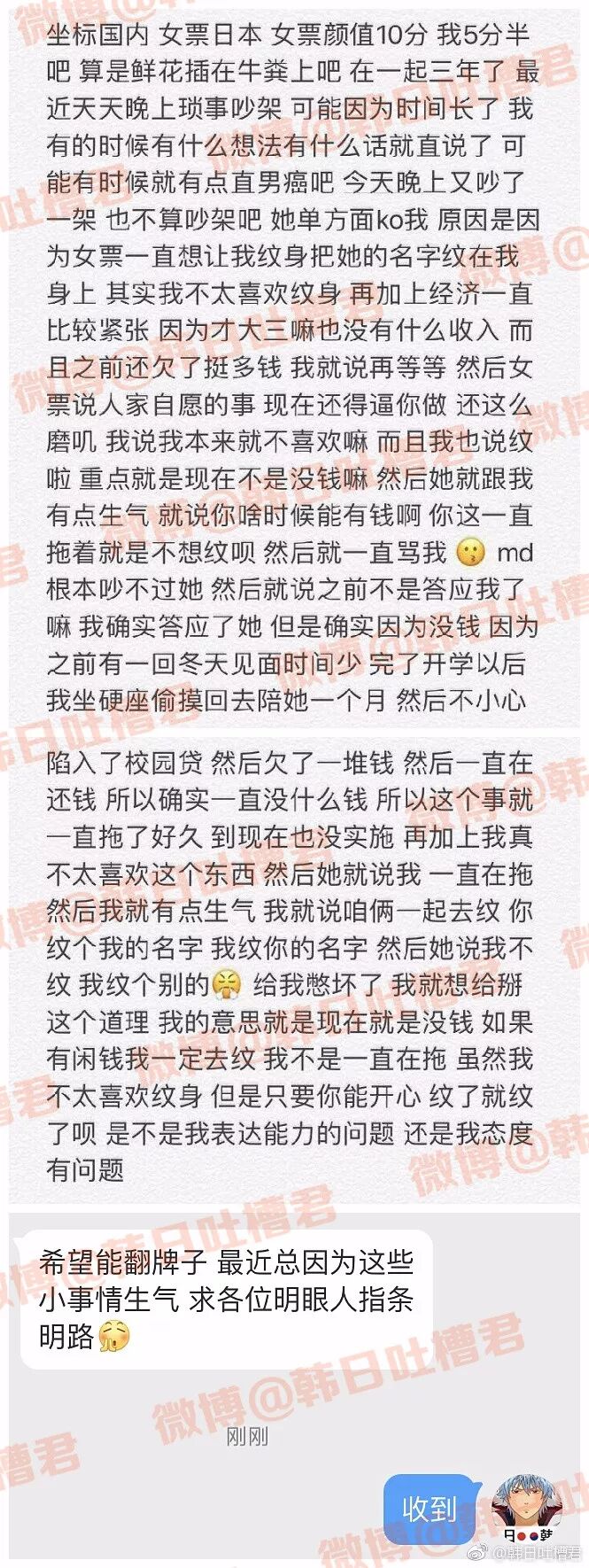 “和女友吵架,因为她让我纹她的名字在身上 而我却没钱也不想纹”