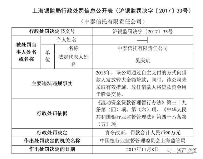 12月6日,上海银监局发布沪银监罚决字〔2017〕33号处罚决定书。公告显示,近日,中泰信托有限责任公司(以下简称“中泰信托”)因违规发放大额贷款,被上海银监局责令改正,并给予90万元罚款的行政处罚。