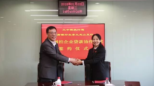 为彻底解决司法网拍大额拍品一次性付款难题,提高网拍成交率、溢价率,2018年1月3日,三中院与中国工商银行北京九龙山支行举行《司法网络拍卖企业贷款协作协议》签约仪式,,实现了对大额拍品司法网拍贷款业务的全覆盖。