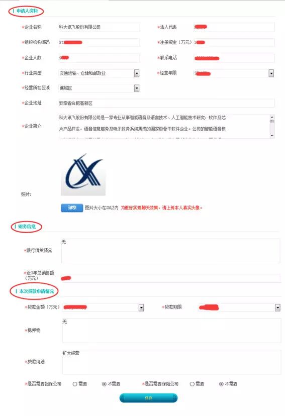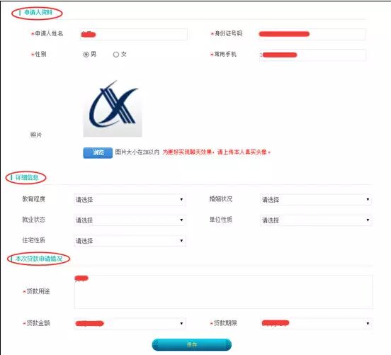 个人申请主要包括申请人基本资料、详细信息、本次贷款申请情况(所有带*的字段为必填项),基本信息完善后,点击“保存”按钮进行贷款申请提交,如图: