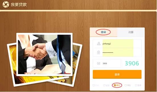 1、银行进入《我要贷款》首页的“登录”页签,输入账号、密码、选择登录用户的身份类型,点击“登录”按钮进入,如图:
