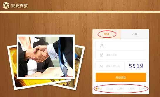 1、担保(保险)进入《我要贷款》首页的“登录”页签,输入账号、密码、选择登录用户的身份类型,点击“登录”按钮进入,如图: