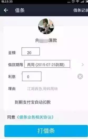 支付宝目前版本不仅能聊天,还能打“借条”。可以约定还款日、利息。到期后,只要支付宝里有钱,就会自动扣除相应的金额。确实很方便也很好用。然而,有人却利用了这个“打借条”功能骗钱!