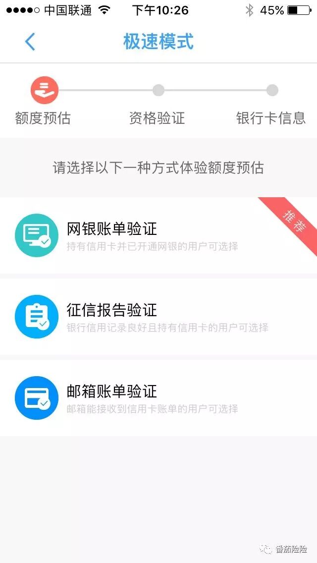 这里有三种验证方式,这里需要注意的是信用卡最好是自己的常用信用卡,且没有逾期最好,第二种验证方式“征信报告验证”需要自己在征信中心网站上https://ipcrs.pbccrc.org.cn/ 注册并登录获取个人征信报告,征信报告并不能立即取得,大概是24小时后才能拿到获取征信的验证码,这个验证码也需要在第二种验证方式中提供,如果准备使用这种验证方式最好提前准备好征信报告,如果个人征信不错的话可以获得较高额度;第三种“邮箱账单验证”要求要有6个月以上的账单记录,不要有不良信息,其它杂乱信息也一并删除,只留下信用卡账单最好。
