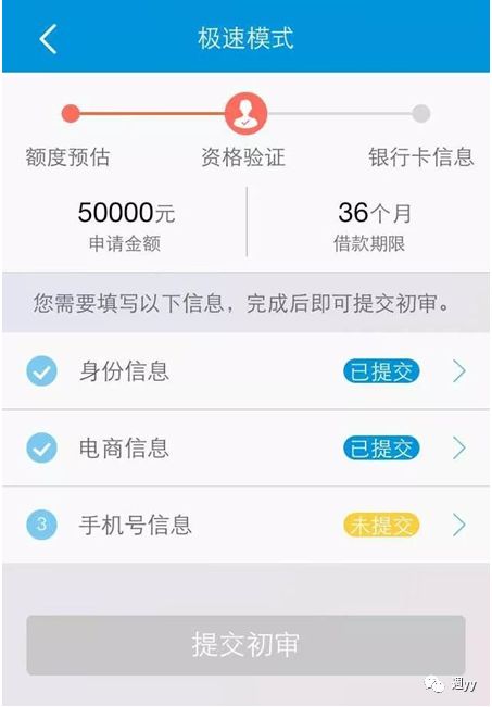 3、接着得出预审批额度,确认申请额度信息之后,提交进入完善资料页面。