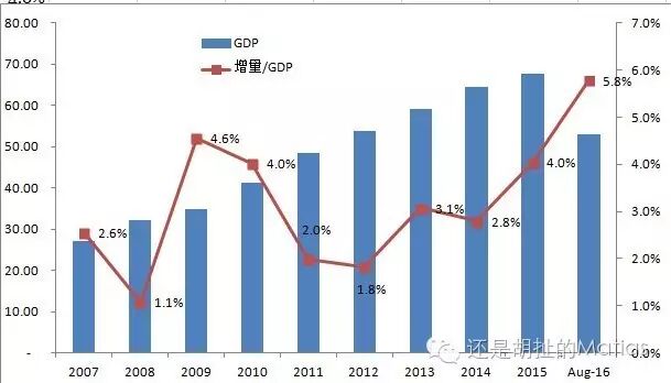 2015年央行多次降准降息,叠加2014年的限购取消,增量首次普通2万亿,甚至接近3万亿,达到2.7万亿;而2016年前8个月,新增居民长期贷款余额已经达到3万亿,超过2015年全年!达到2016前三季度(预估值)GDP比重5.8%,这恐怕是创历史新高了!