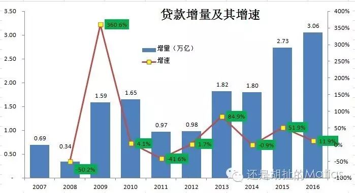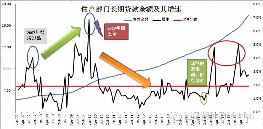 2007年才只有2万亿左右,即使看增速,在07年所谓经济过热的时候,贷款增速达到4.5%左右,考虑到我们是使用存量分母,这个增速其实已经非常可观了;但,跟10年某个时间节点还是有差异,这个节点就是2010年9月之前,,贷款已经井喷了,贷款增速达到令人惊叹的7%,,迅速将贷款增速达到平均值(1.9%)以下,而且增速,长期低于1.9%(从2007年1月到2016年8月)。