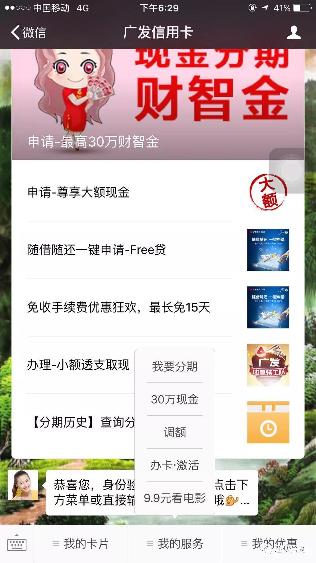 2、微信关注【广发信用卡】公众号 - 直接点"30万现金" - 申请"Free贷"即可