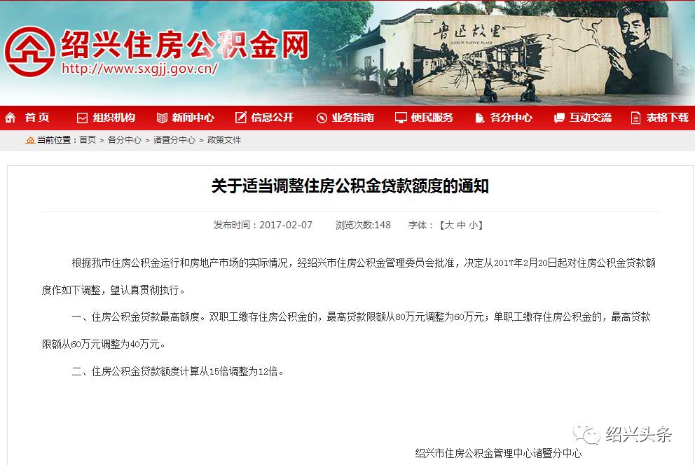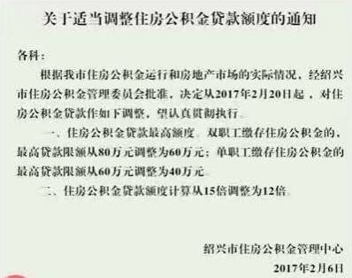 根据我市住房公积金运行和房地产市场的实际情况,经绍兴市住房公积金管理委员会批准,决定从2017年2月20日起对住房公积金贷款额度作如下调整,望认真贯彻执行。