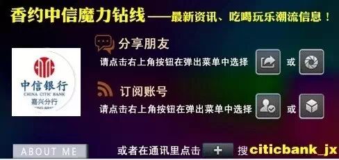 更多最新资讯、吃喝玩乐信息敬请关注“香约中信魔力钻线”公众平台,微信号:citicbank_jx。