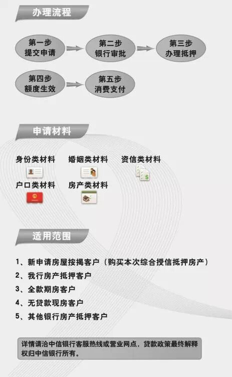 装修房子、置办家具、出境旅游、出国留学……中信银行“房产抵押综合消费贷款”帮您“搞定。授信申请人可将其名下的自有房产以最高额抵押的形式向我行申请综合授信额度。在不超过授信额度有效期和可用额度的条件下,被授信人可多次向我行申请发放具有明确消费用途的个人贷款业务,额度可循环使用。