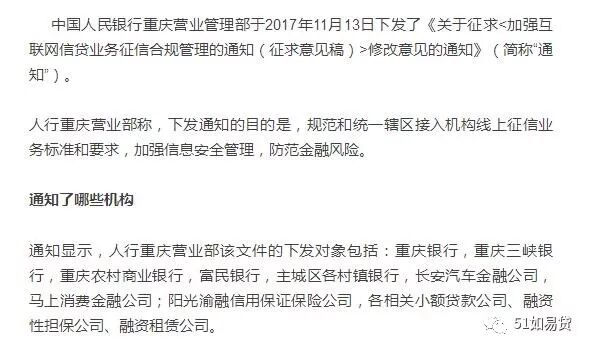 人行重庆营业部在此次关于互联网信贷征信合规的通知中,要求各公司高度重视,结合业务情况及时反馈,将书面意见于2017年11月24日17:00前反馈至人行重庆营业部。