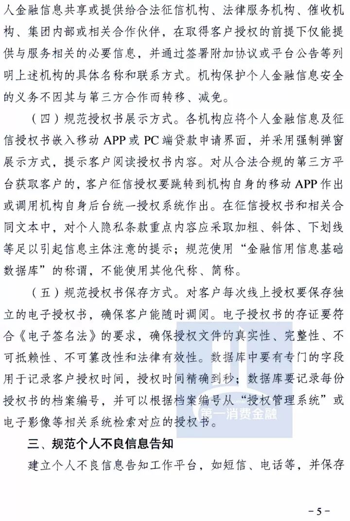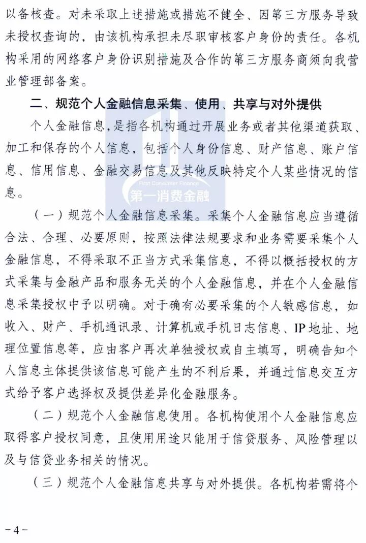 人行重庆营业部在通知中称,“采集个人金融信息应当遵循合法、合理、必要原则,按照法律法规要求和业务需要采集个人金融信息,不得采取不正当方式采集信息,不得以概括授权的方式采集与金融产品和服务无关的个人金融信息,并在个人金融信息采集授权中予以明确。对于确有必要采集的个人敏感信息,如收入、财产、手机通讯录、计算机或手机日志信息、IP地址、地理位置信息等,应由客户再次单独授权或自主填写,明确告知个人信息主体提供该信息可能产生的不利后果,并通过信息交互方式给予客户选择权及提供差异化金融服务。”