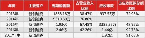 此后,致生联发的应收账款连续增长,2016年、2017年中报,其应收账款分别为1.47亿和1.98亿。从那时开始,新创迪克就成为了致生联发应收账款里的常客,2016年占比更是高达92.75%。