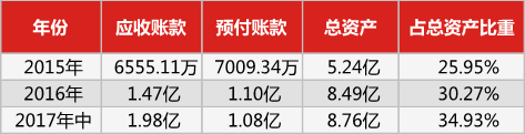 也是从那年开始,应收账款和预收账款便头也不回,一路向上。2015年-2017年中报,致生联发的应收账款(不包括长期应收款)和预收账款之和分别为1.36亿、2.57亿、3.06亿,分别占到了总资产的25.95%、30.27%、34.93%。