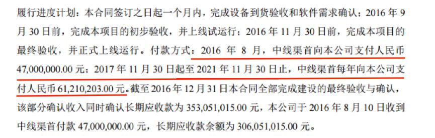 也就是说,2016年项目建设完成后,中线渠首首先向公司支付4700万元,此后2017年至2021年,每年支付6121万。2016年,致生联发已经确认了该项目收入2.75亿元,这笔收入占到当期收入的50%,同期公司营业收入增长103.53%。换句话说,公司2016年的营收增长几乎全部来自于此。