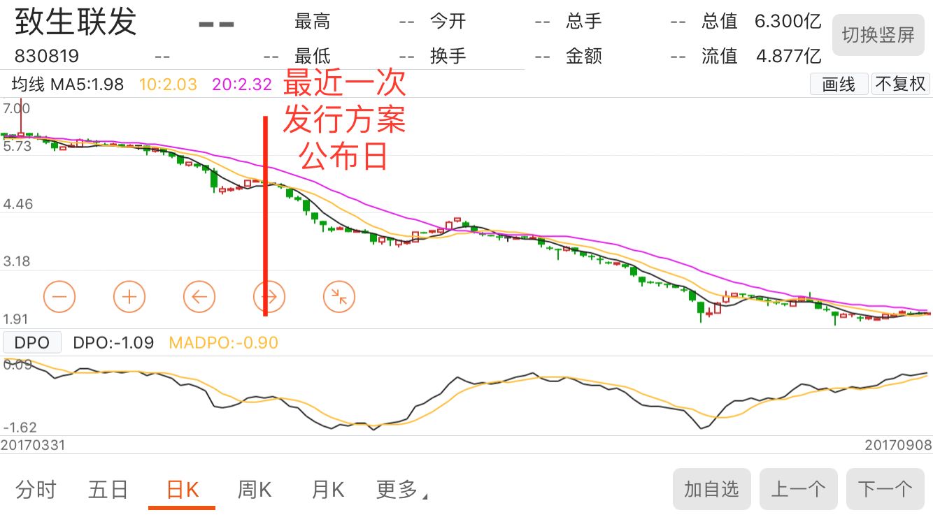 后来,因发行方案调整,致生联发撤回了申请。5月16日,致生联发再次发布发行方案,价格和金额没有变化。但是,发行方案重新发布的半个月内,股价从5.14元下跌至4.14元,下跌19.5%。与发行的最低价相比,也相差16.36%。