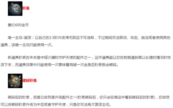 解析:根据上面的描述来看,这两件道具都是新版本之中所出现的道具,它们都是合成中亚沙漏和守护天使的小件,当你出到秒表这个道具的时候,你就拥有了一次金身的效果,这个效果就是沙漏的主动效果,他能够让你在2.5秒变得不可选取,免疫一切伤害,这个效果其实还是蛮不错的,不过在小编看来,前期用600金币去投资一个只能够使用一次金身的道具,并不是很划算,不过对于很多英雄在中路对线劫、小鱼人等强势刺客的时候,可以在快要达到六级的时候选择出一个秒表,来规避六级的最强一套爆发,因为这些英雄很有可能第一个大件选择中娅,这样看来就比较划算了。
