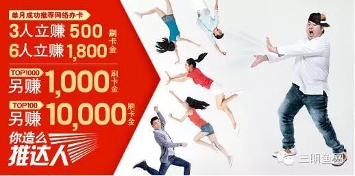 7-9月期间每月至少成功推荐1人(含)的推荐人可参与排名活动:3个月累计成功推荐4人及以上、排名前1000名可获赠1000元刷卡金;3个月累计成功推荐7人及以上、排名前100名可获赠10000元刷卡金!