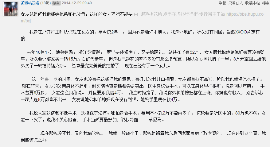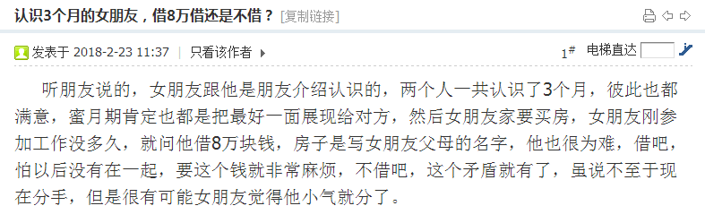 网友 @邂逅桃花缘 的女友在恋爱一年时,向他借8万块,原因是弟弟为了娶媳妇已经花了50多万,弟媳家还要求再添置一辆车,但他们家已经没啥钱了。